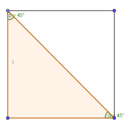 Consideriamo ora un triangolo rettangolo isoscele ABC. I suoi due cateti sono congruenti e gli angoli misurano 45°. Un triangolo con queste caratteristiche è la metà di un quadrato che ha per lato un cateto e per ipotenusa la diagonale.