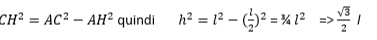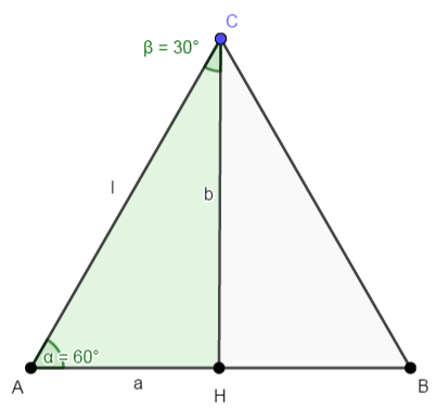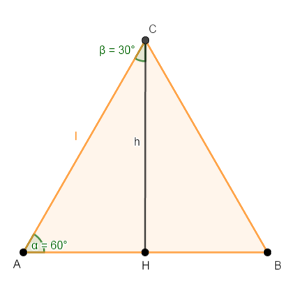 Consideriamo un triangolo equilatero ABC, di cui conosciamo la misura l del lato. Tracciamo l’altezza CH relativa al lato AB e indichiamo con h la sua misura. Il triangolo ABC rimane diviso in due triangoli rettangoli, perciò possiamo applicare il teorema di Pitagora, per esempio al triangolo CAH. L’altezza è anche mediana, perciò : AH = HB = l/2.